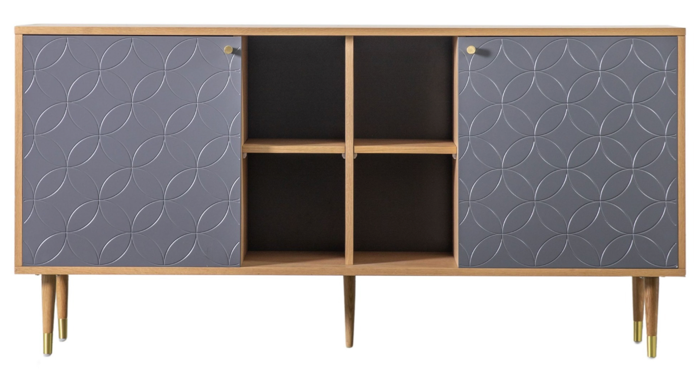 Add a statement to your space with the Newbury Sideboard. Finished in white with an oak-effect veneer, this piece pairs style with practicality. The carved geometric door design, brass handle and brass-tipped oak legs make it a real eye-catcher, while offering useful storage for any room. Also available in white, with matching pieces in the Newbury collection.